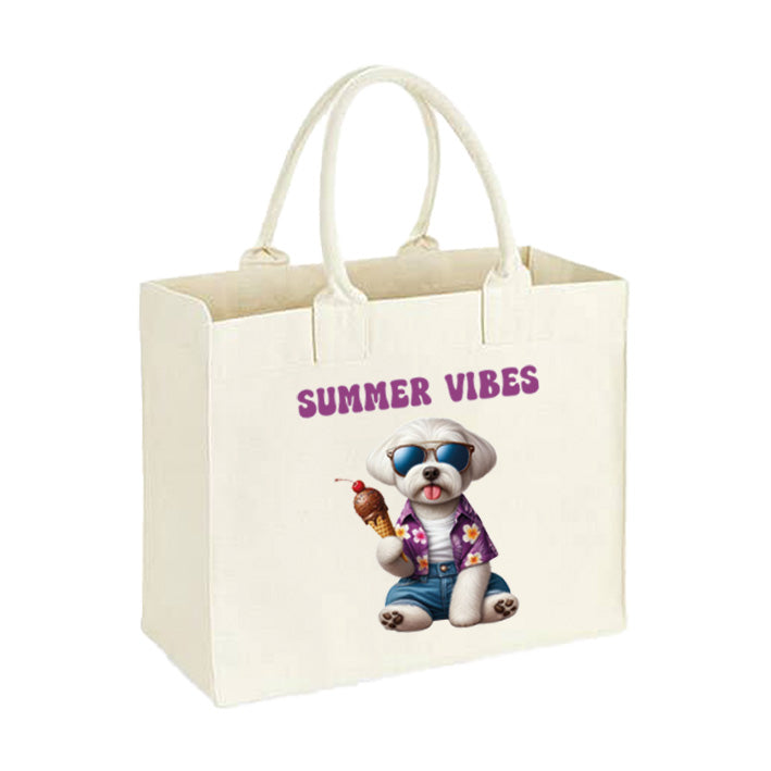 🌞 Sonnige Stimmung to go? Diese bezaubernde Canvas Bag bringt nicht nur alles unter, was du im Alltag brauchst – sie bringt auch dein Herz zum Strahlen! Der Aufdruck zeigt einen süßen Malteser im Hawaiihemd, cooler Sonnenbrille und einem Eis in der Pfote. Darüber tanzt der vintage Style Schriftzug „Summer Vibes“ – ein echtes Mood-Statement für alle, die Sonne, Leichtigkeit und tierisch gute Laune lieben.