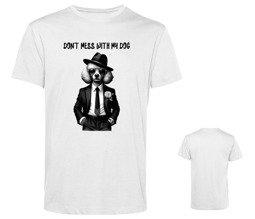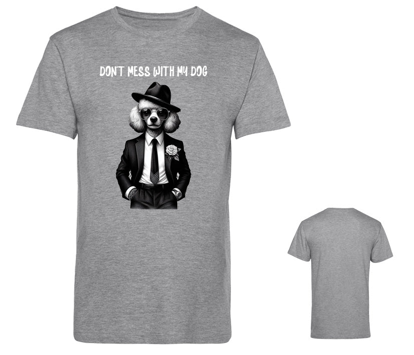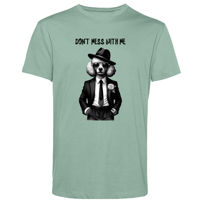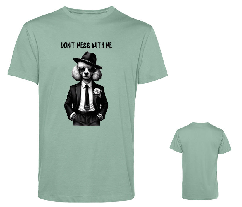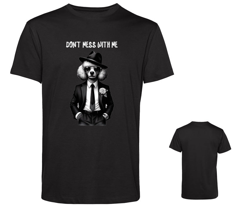 👕 Das Herren-T-Shirt mit dem Print „Don’t mess with me“ (wahlweise „Don’t mess with my dog“) zeigt deinen Vierbeiner in seiner coolsten Form – als smarter Pudel im Anzug mit Sonnenbrille. Elegant, eigenwillig, absolut loyal. Genauso wie du.